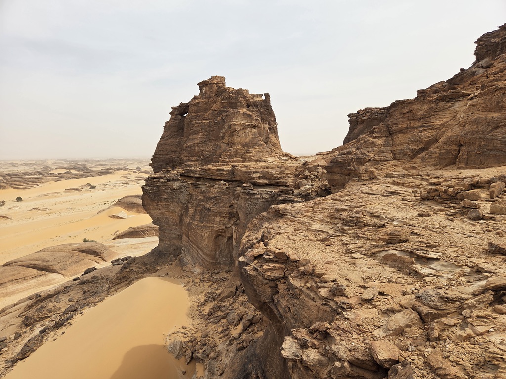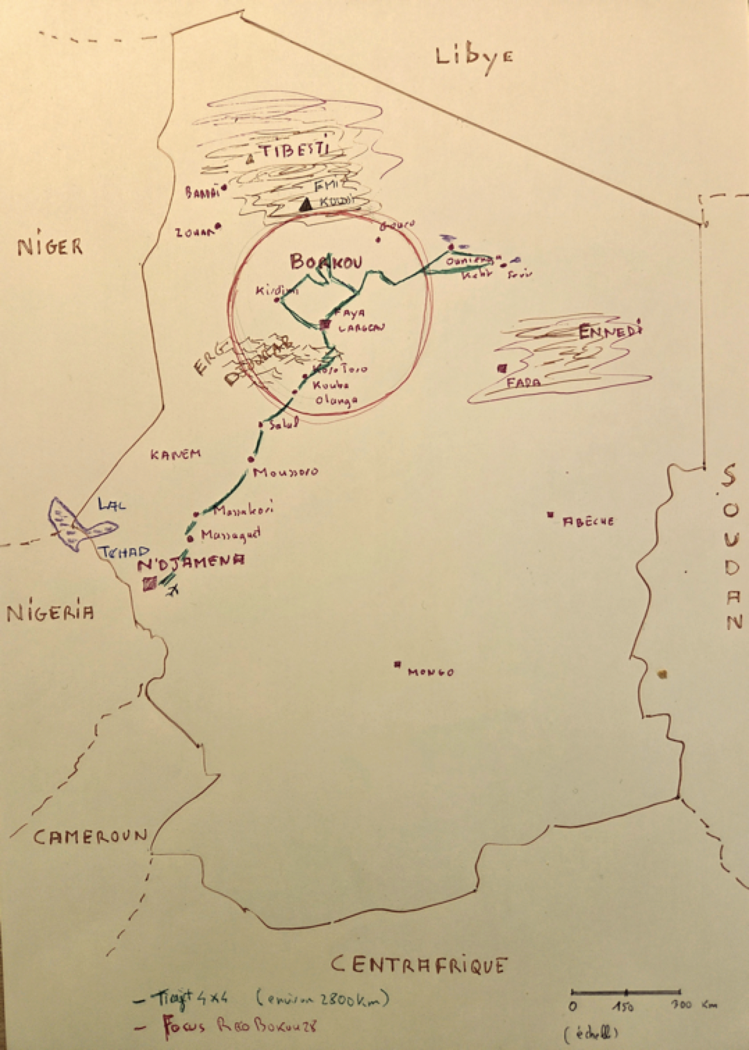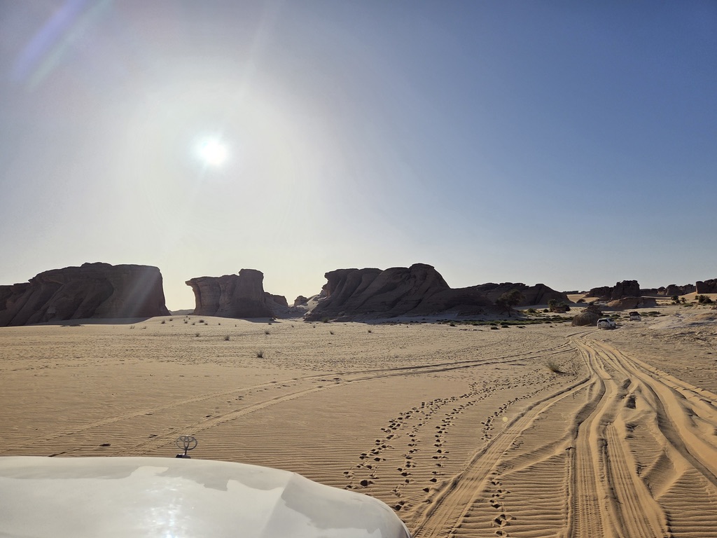 Après une nuit de repos dans l’enclos d’une demeure, nous nous préparons pour la phase de reconnaissance proprement dite. Le point est d’identifier rapidement des lieux qui pourraient servir de camps de base, de villages de départ et d’arrivée pour des étapes en étoiles. Après quelques discussions entre nous, des échanges avec Guini et les guides locaux,  nous décidons de partir vers Yarda, et son site de peintures rupestres pour tenter de rejoindre les oasis de  Depuis Faya nous remontons vers le Nord en direction de Yarda, pour tenter de joindre directement les nombreux sites et oasis qui sont bordés par des falaises de grès, les citadelles du Borkou, Une immense barrière rocheuse domine l’oued que nous traversons, laissant sur notre droite la piste qui mène à Gouro. Cette dernière se révèle âpre et cassante. Nous progressons plus que lentement, nous nous ensablons à tour de rôle. Après de très longues heures, nous parvenons à Kouroudi point d’entrée du Tibesti. Kouroudi, que je reconnais aisément pour y avoir passé deux jours lors de mon raid en direction de l’Emi Koussi en 2024**