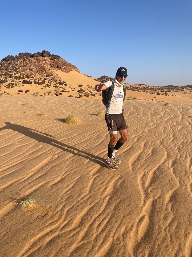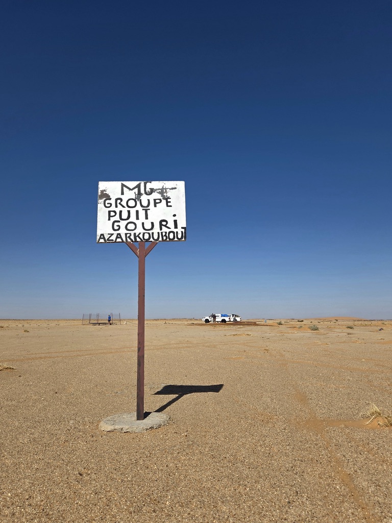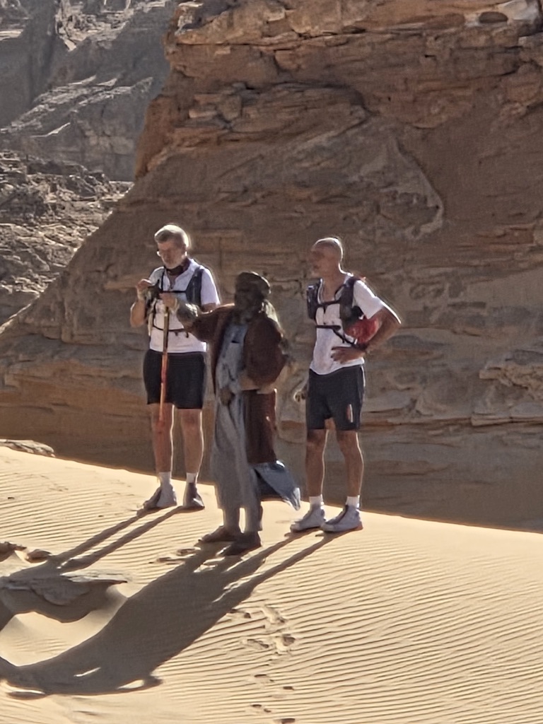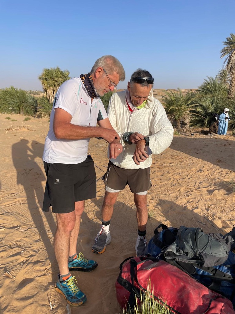 Lors du quatrième  jour de ce cycle de reconnaissance nous nous rendons à Tigui Rocher, et ses quatres pitons dominant les yégués du village qui se situe à environ vingt cinq kilomètres pour tracer un parcours de  entre cette oasis et celle de Bedo et ses salines blanchies par le natron. Un long raid en ligne droite, ou presque, que nous enchainons sous une grosse chaleur. Impossible pour moi de courir dans cette fournaise, je gère en réfrigérant mon corps au mieux. Frédéric et Jean Victor tentent une variante plus au nord. Nous les perdons rapidement de vue. Après plus de quatre heures d’effort, nous parvenons au puits d’une petite localité. Nous retrouvons Frédéric, mais pas Jean Victor. Ce dernier semble avoir tracer encre plus au nord. Nous nous arrosons. Trois petites filles goranes rient à la vue de nos dégaines et nos têtes desséchées. Nous leur offrons les oranges que nous avions dans nos sacs. Nous adressons nos salutations au papa du village et retournons au camp de base de la veille. Nous repartons en direction de Orori Rocher. La trace s’arrête là, mais en fait il reste quelques kilomètres avant de rejoindre le point d’arrivée.(un grand classique de Jean Philippe)