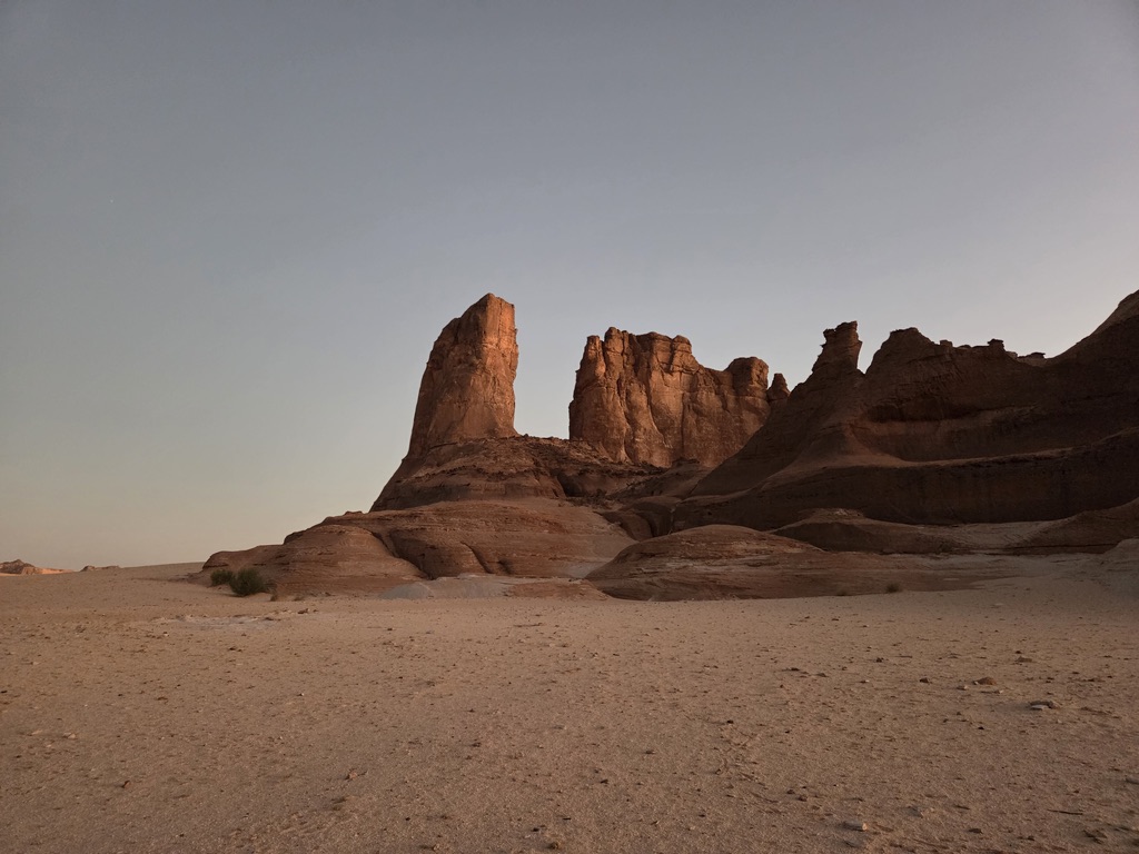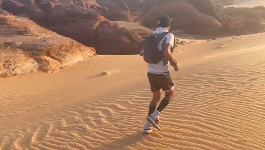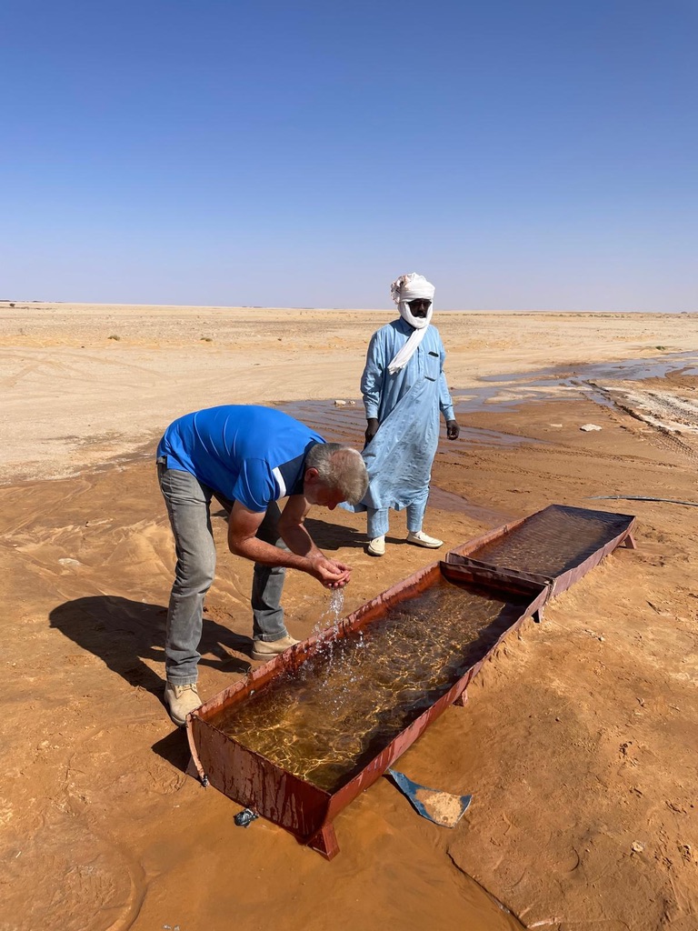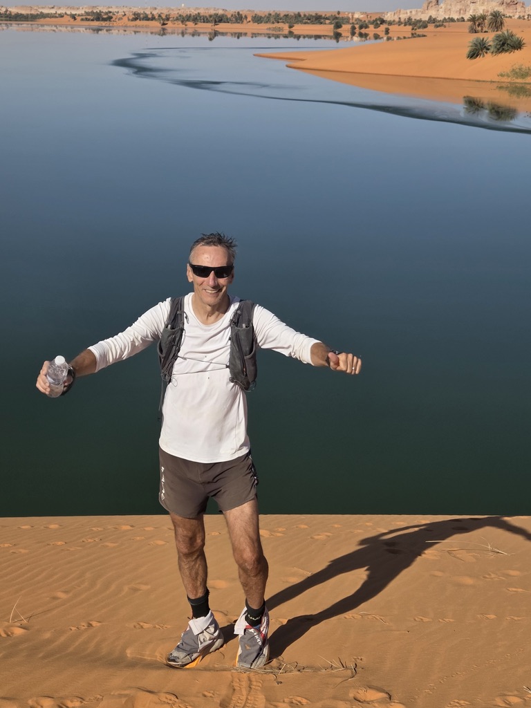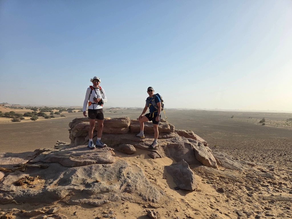 Lors du quatrième  jour de ce cycle de reconnaissance nous nous rendons à Tigui Rocher, et ses quatres pitons dominant les yégués du village qui se situe à environ vingt cinq kilomètres pour tracer un parcours de  entre cette oasis et celle de Bedo et ses salines blanchies par le natron. Un long raid en ligne droite, ou presque, que nous enchainons sous une grosse chaleur. Impossible pour moi de courir dans cette fournaise, je gère en réfrigérant mon corps au mieux. Frédéric et Jean Victor tentent une variante plus au nord. Nous les perdons rapidement de vue. Après plus de quatre heures d’effort, nous parvenons au puits d’une petite localité. Nous retrouvons Frédéric, mais pas Jean Victor. Ce dernier semble avoir tracer encre plus au nord. Nous nous arrosons. Trois petites filles goranes rient à la vue de nos dégaines et nos têtes desséchées. Nous leur offrons les oranges que nous avions dans nos sacs. Nous adressons nos salutations au papa du village et retournons au camp de base de la veille. Nous repartons en direction de Orori Rocher. La trace s’arrête là, mais en fait il reste quelques kilomètres avant de rejoindre le point d’arrivée.(un grand classique de Jean Philippe)