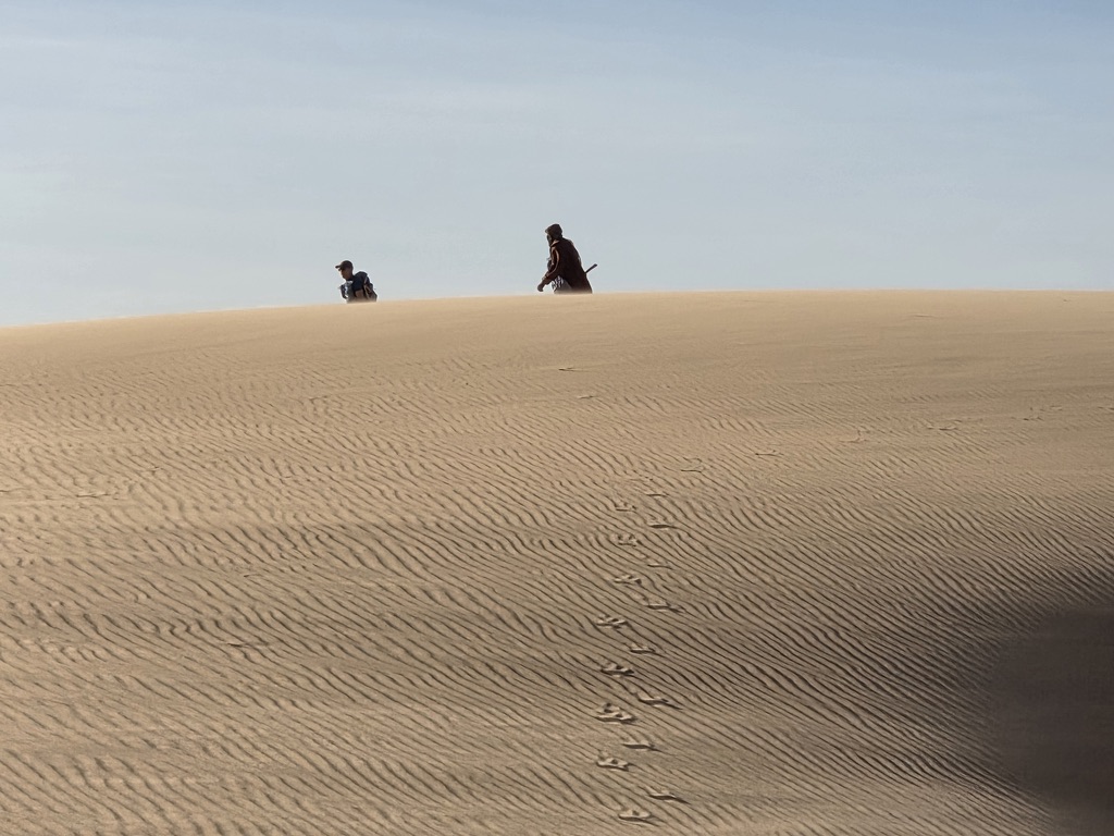 Je décide de me mettre dans les pas de Frédéric qui avance vite. Je laisse Jean Philippe, Jean No et un de nos guides derrière moi. Au bout d’un ou deux kilomètres, je perds de vue Fred, mais je me fie en toute confiance aux traces de ses chaussures de trail dans le sable. Erreur ! N’ayant pas pris le soin de repérer le point d’arrivée estimé du parcours, me raccrochant sans y réfléchir à celui qui est devant, je commets là une faute de débutant.
