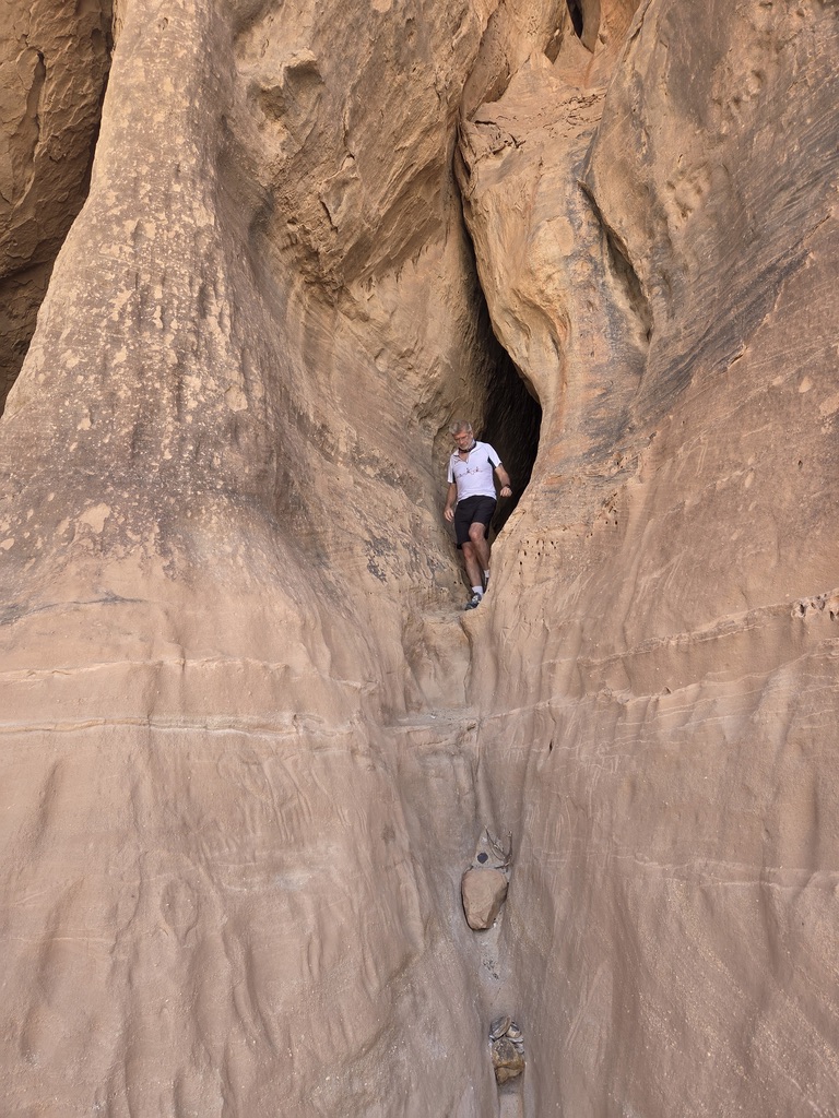 J’arrive dans une partie plus pierreuse constituée de grandes plaques de grés. Plus de traces bien entendu, et surtout pas de cheminement évident. Je tente plusieurs allers retours afin de retrouver des indices du passage de Fred. En vain. Rien de bien concret. Je suis tanké dans un mini canyon sans visibilité et il commence à faire très chaud. Je me décide à retourner sur mes pas espérant retrouver le guide et mes autres compagnons. Mais je ne les vois pas. Je reviens plus en arrière encore et grimpe sur un monticule afin d’avoir un plus grand champ de vision. Enfin je les aperçois au loin qui m’attendent, et surement aussi Jean Victor ! Lui n’arrivera que plus de trois heures après…