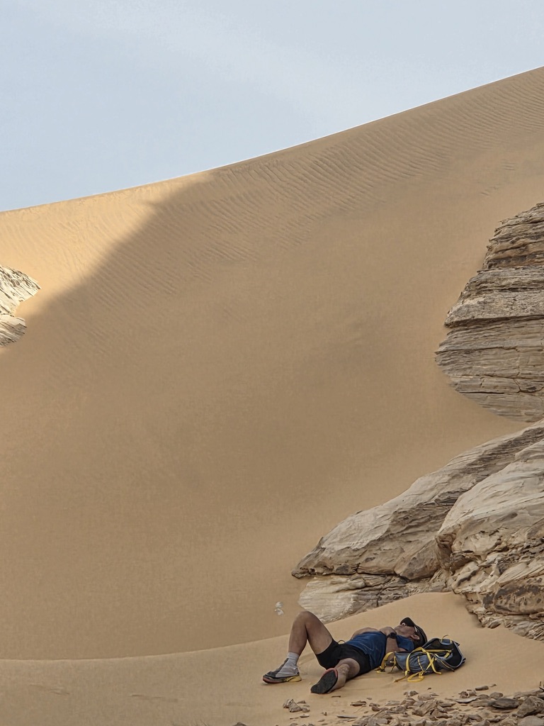 La troisième sortie, celle en forme de rectangle, fut littéralement magique. Malgré un départ vers quinze heures, sous une chaleur accablante, nous longeons un tassili sans fin, aux arcannes invitant aux variantes, subissant les assauts d’immenses vagues de sable fin. Nous nous séparons en deux équipes pour évaluer les multiples possibilités et variantes qu’offre ce terrain de jeu. Puis, sur la seconde partie, sous les rayons obliques d’un soleil désormais rouge, Jean No et moi enquillons une espèce de canyon parcouru en son lit par un cordon dunaire à la couleur de plus en plus ocre. Les deux groupes convergent un peu plus loin et nous poursuivons jusqu’à son terme cette rivière minérale observant le déclin du soleil incendiaire derrière les barrières rocheuses embrasées. Nous parviendrons la nuit tombée au campement.