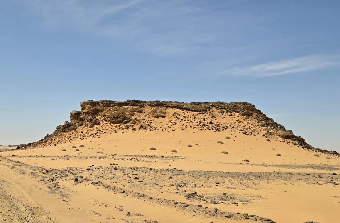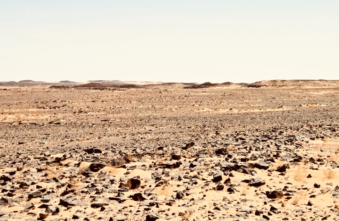 Nous repartons le lendemain en direction des lacs Ounienga Kebir et Serir. Nous empruntons la piste historique qui monte à Gouro, celle qu’emprunta la fameuse colonne Leclerc lors de la seconde guerre mondiale. Piste qui traverse les stries ocre et noires du Bembéché, piste jalonnée de grands cairns visibles de loin, piste qui navigue ensuite sur une vaste étendue plane, aride et qui monte au ciel.