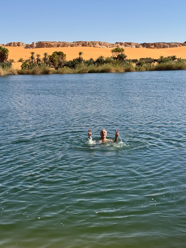 Nous bivouaquons prés du lac Yoa aux eaux fossiles vertes et légèrement teintées de natron dont nous faisons le tour à pied (environ 12km) puis nous dirigeons vers les lacs de Serir. Nous nous baignons dans le petit lac du Bokkou, profond d’une trentaine de mètres dans une eau douce et fraîche. Que du bonheur!