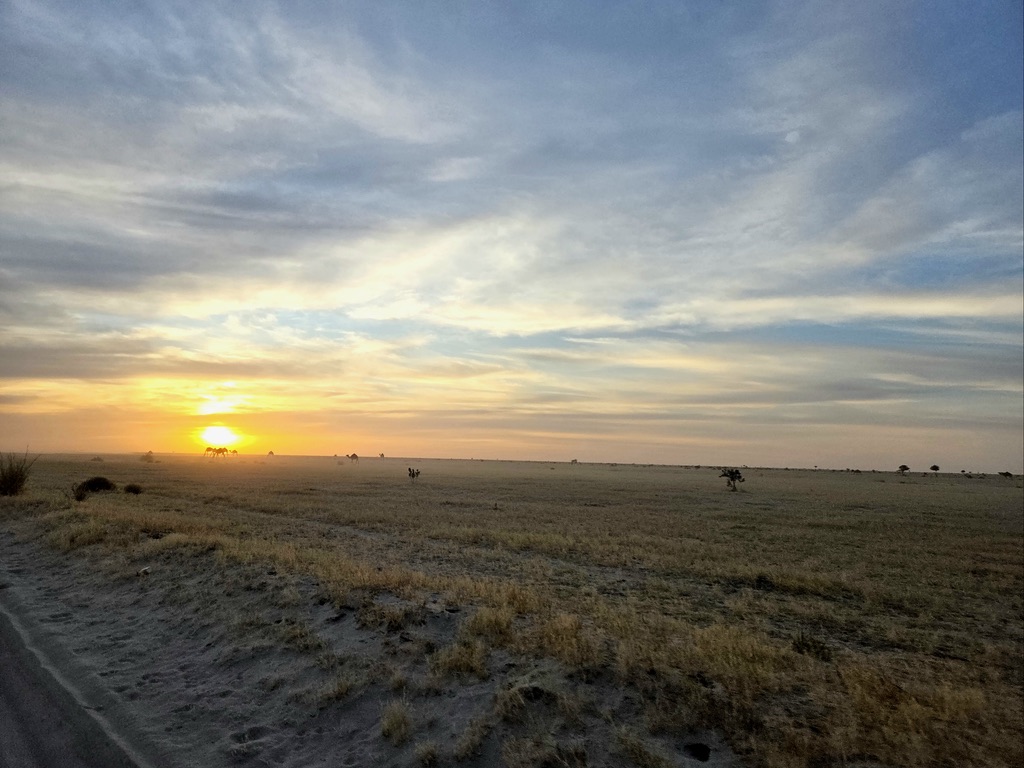 Le site de Orori Rocher s’avèrera intéressant avec un large à-plat  ceinturé de grands blocs et pitons aux belles couleurs ocres en cette fin de journée.  Nous installons le bivouac sous un ciel étoilé tandis qu’une pleine lune opaline inonde de sa douce lumière tamisée.  Nous sommes immergés dans un paysage minéral comme je les aime, fait de grandes dalles gréseuses polies par l’érosion, qui dessinent un écrin idéal et dans lequel j’ai envi de me glisser. L’ambiance se fait encore plus chaleureuse entre nous et les membres de l’équipe qui nous accompagne. Nous aidons comme nous pouvons Marcus, le cuisinier, à préparer le dîner. Les chauffeurs et guides se chambrent entre eux et éclatent de rire.   La piste nous a bien rapproché.  Le feu crépite. Nous profitons chacun à notre manière de ces instants uniques que nous avons la chance de vivre. Frédéric met un nom sur chacune des planètes, des constellations qui s’offre à nous. Je l’écoute, je tente de mémoriser, mais surtout je m’évade. Je m’endors la tête dans les étoiles.
